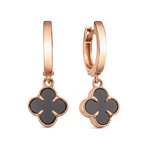 Серьги "клевер" с ониксом — это изящное и стильное украшение, которое сочетает в себе символику удачи и природные красоты камня. Дизайн серёг вдохновлён формой четырёхлистного клевера, который считается символом счастья и благополучия во многих культурах.