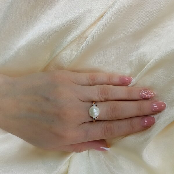 Нежное кольцо выполнено из красного золота 585 пробы, украшено великолепным жемчугом белого цвета