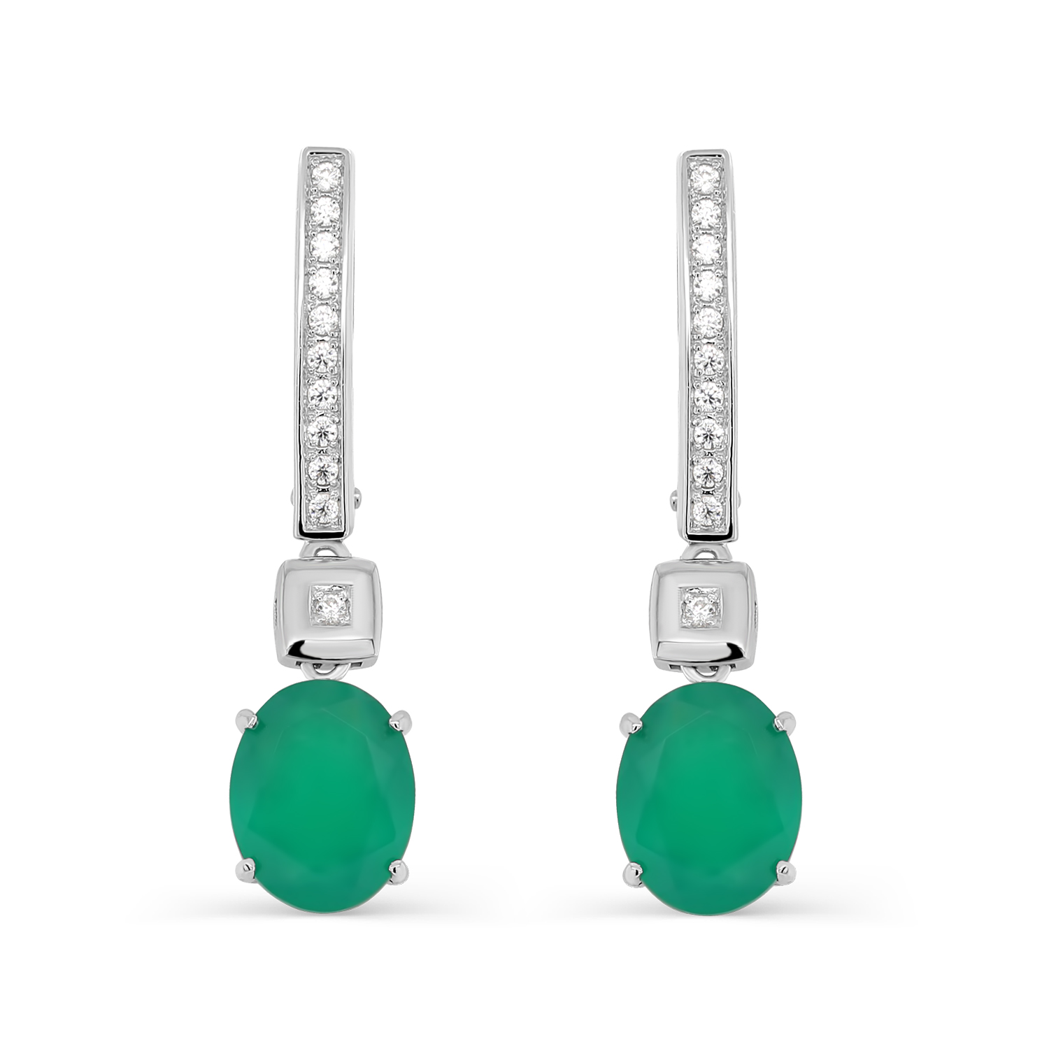 Серьги с подвесом, выполнены из серебра 925 пробы с родиевым покрытием, украшены ониксами зелёного цвета и искрящейся россыпью фианитов.