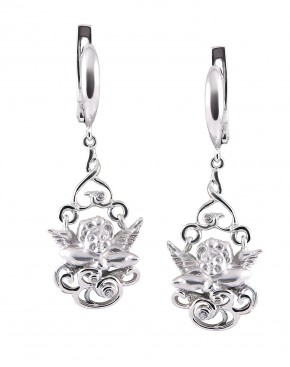 Нежные серьги с подвесом, в виде ангнела, выполнены из серебра 925 пробы, украшены сверкающими фианитами Сваровски.