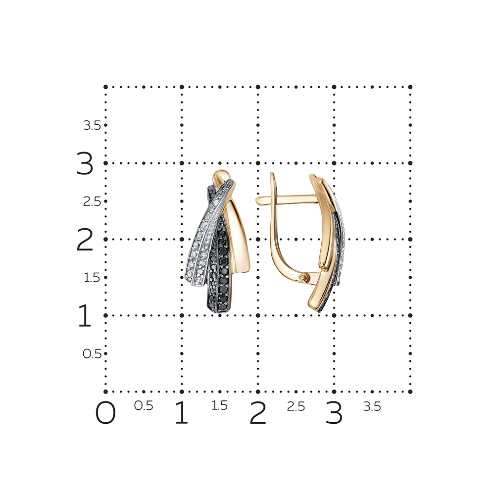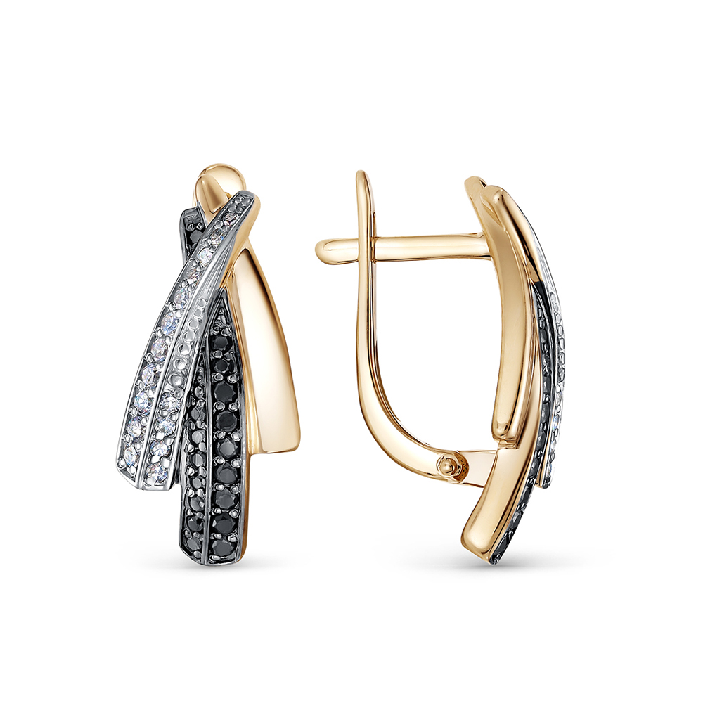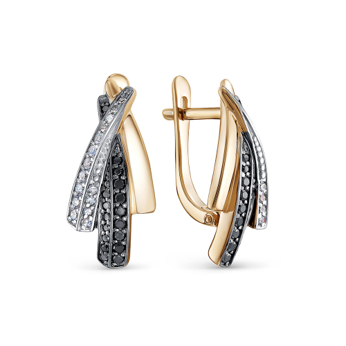 Оригинальные серьги с контрастным дизайном из изящных полос красного и белого золота 585 пробы, украшенных чёрными и бесцветными сверкающими бриллиантами