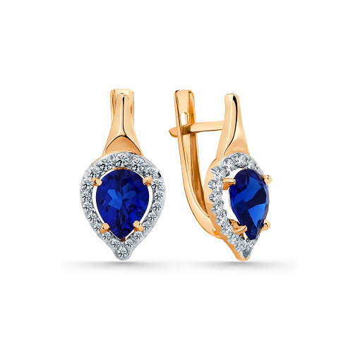 Изящные серьги с синими сапфирами в окружении сверкающих фианитов, выполнены в сочетании красного и белого золота 585 пробы. Серьги станут модной изюминкой в повседневном или деловом образе, а также стильно дополнят вечерний или коктейльный наряд. Тип замка - английская застежка, самый надежный и удобный. Изделие представлено брендом MAGIC STONES. В комплект поставки входит: