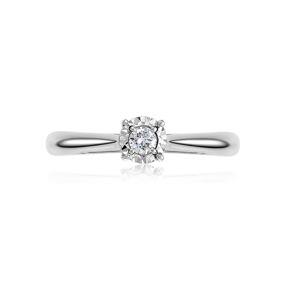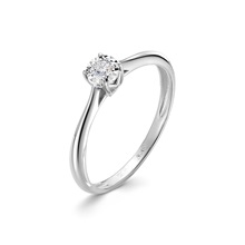 Помолвочное кольцо выполнено из белого золота 585 пробы, украшено сияющим бриллиантом