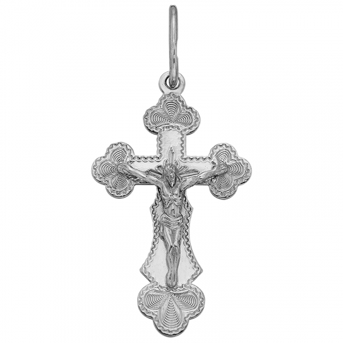 Подвеска в виде нательного креста классической формы выполнена из серебра 925 пробы с фактурным ажурным рисунком. Крест соответствует всем канонам Православной церкви, на внешней стороне - распятие, на обороте надпись "Спаси и сохрани". Украшение покрыто металлом платиновой группы - родием, он защищает серебро от потемнения и придает искрящийся яркий блеск. Изделие представлено брендом СИЛВЕРК.