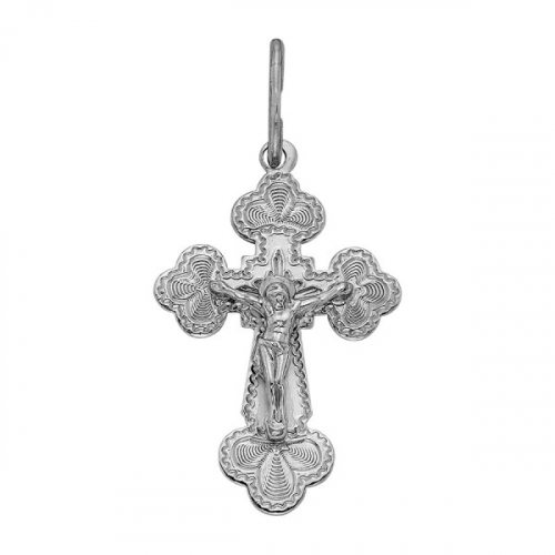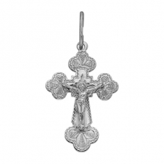 Подвеска в виде нательного креста выполнена из серебра 925 пробы с фактурным ажурным рисунком