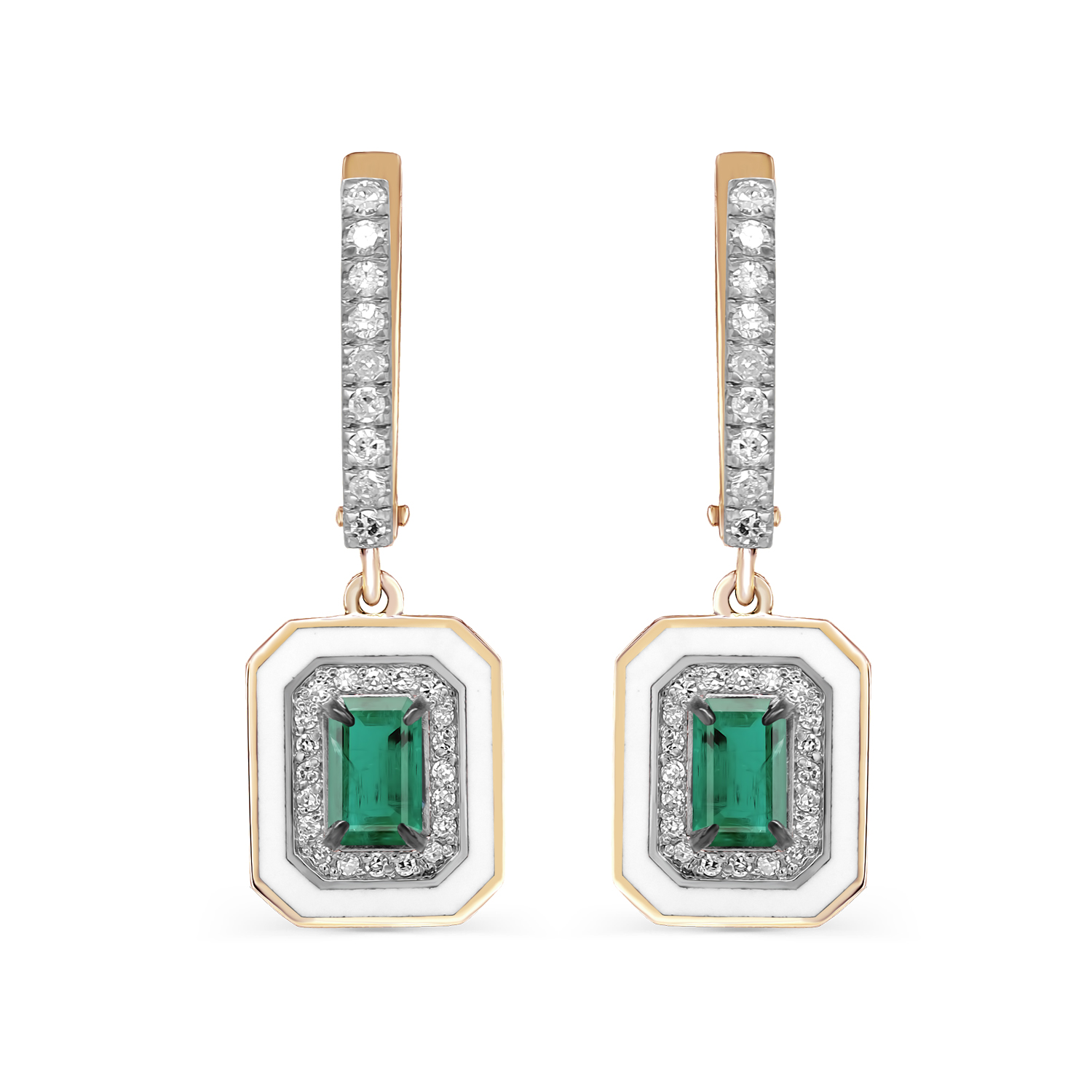 Изысканные серьги, сочетающие в себе красное и белое золото, украшены центральным изумрудом и сияющими бриллиантами