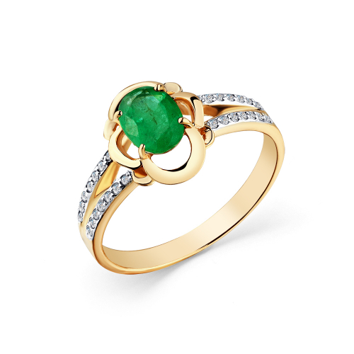 Кольцо, сочетающее в себе красное и белое золото, украшено изысканным изумрудом, окруженным блестящими бриллиантами