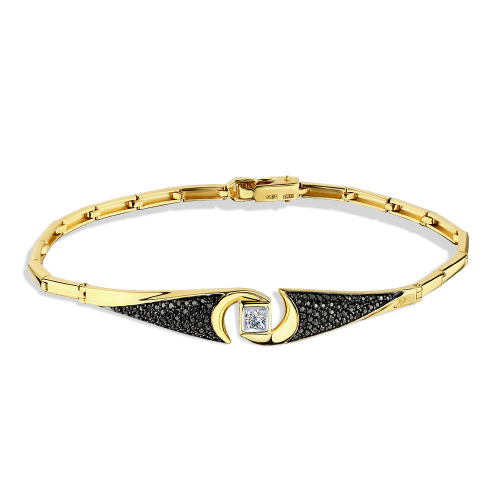 Браслет из желтого золота, украшенный черными бриллиантами и центральным белым бриллиантом, представляет собой уникальное сочетание классических и современных элементов