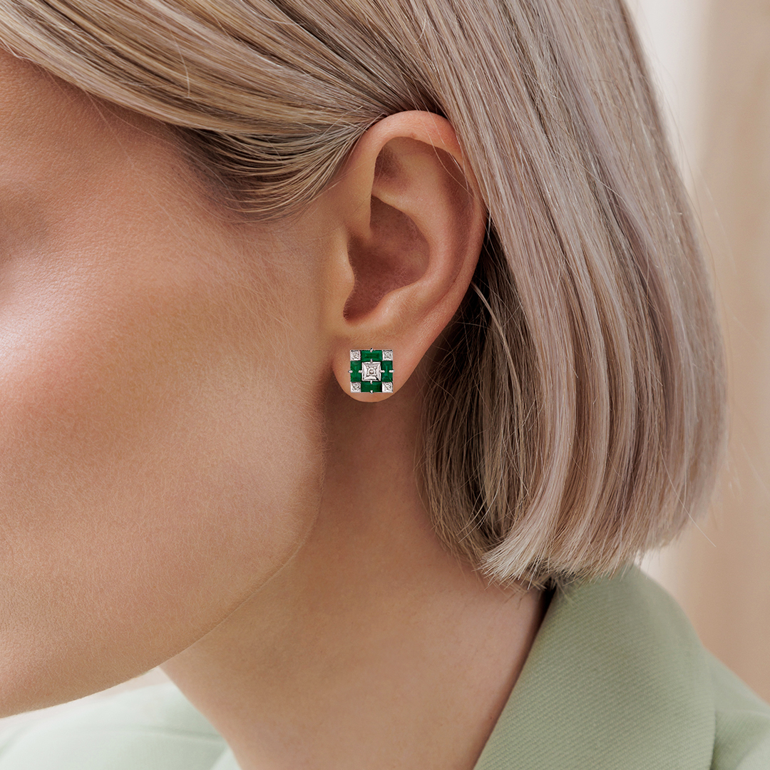 Геометрические пусеты из белого золота с изумрудами и бриллиантами — это стильная комбинация современных форм и классических драгоценных камней