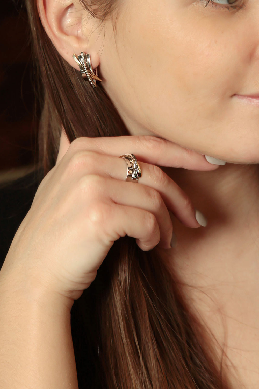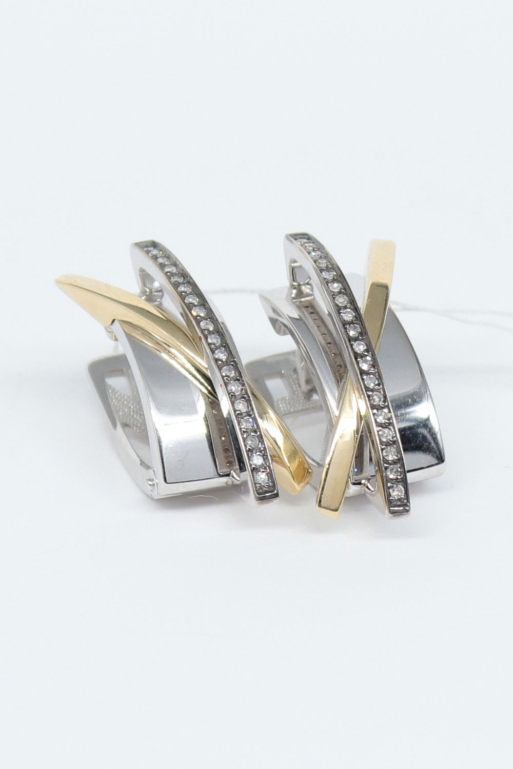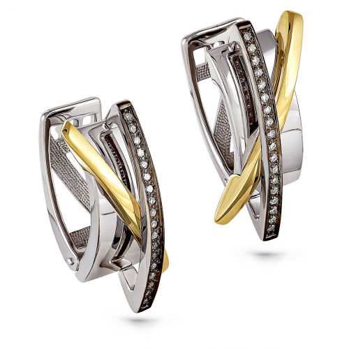 Уникальное сочетание оттенков белого и желтого золота 585 пробы подчеркивает выразительность крупных геометрических форм украшений