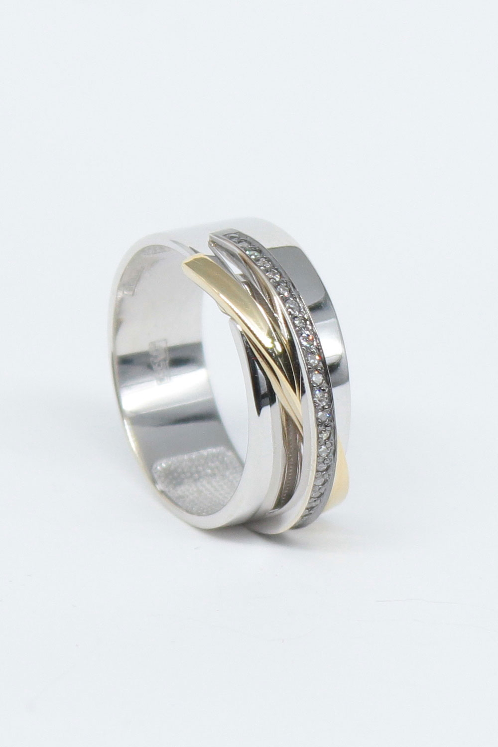 Стильное крупное женское кольцо, выполненное в стиле геометрия, в сочетании белого и желтого золота 585 пробы с бриллиантами