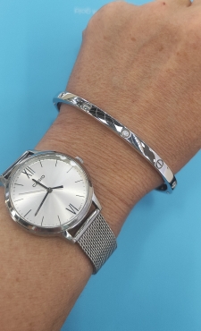 Жесткий браслет из белого золота 585 пробы, украшенный сверкающими фианитами, — это воплощение элегантности и стиля