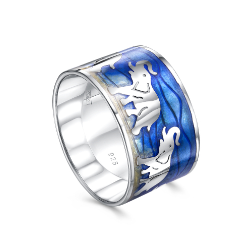 Серебряное кольцо с узорами в виде слонов украшено холодной эмалью, добавляющей изделию изысканности и утонченности
