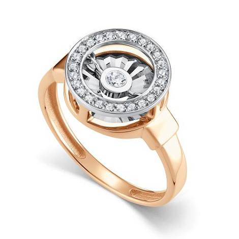 Эффектное кольцо выполнено с сочетанием красного и белого золота 585 пробы, украшенное сияющим бриллиантом