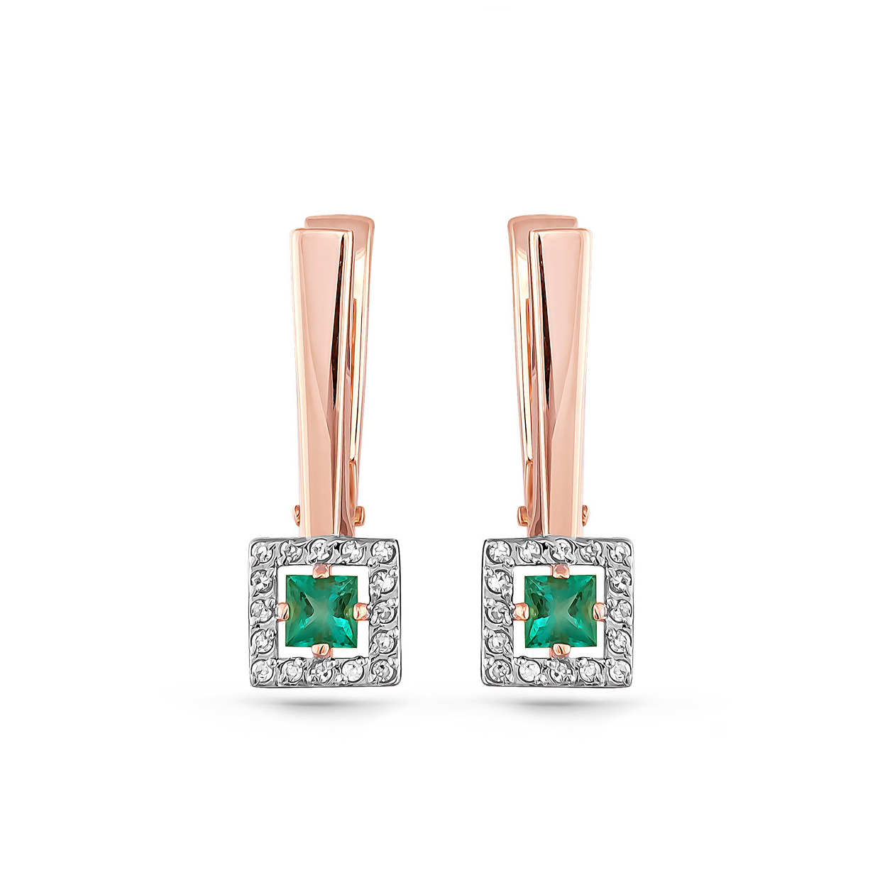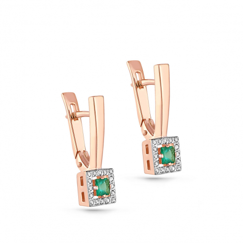 Элегантные серьги с изумрудами в окружении сверкающих бриллиантов, выполнены с сочетанием красного и белого золота 585 пробы.Тип замка - английский, самый надежный и удобный. Изделие представлено брендом "KABAROVSKY". Средняя характеристика камней на артикул: 2 Изумруд н. Кв 0.276ct; 32 Бр Кр-17 0.113ct; К украшению прилагается сертификат от производителя о подлинности драгоценных камней.