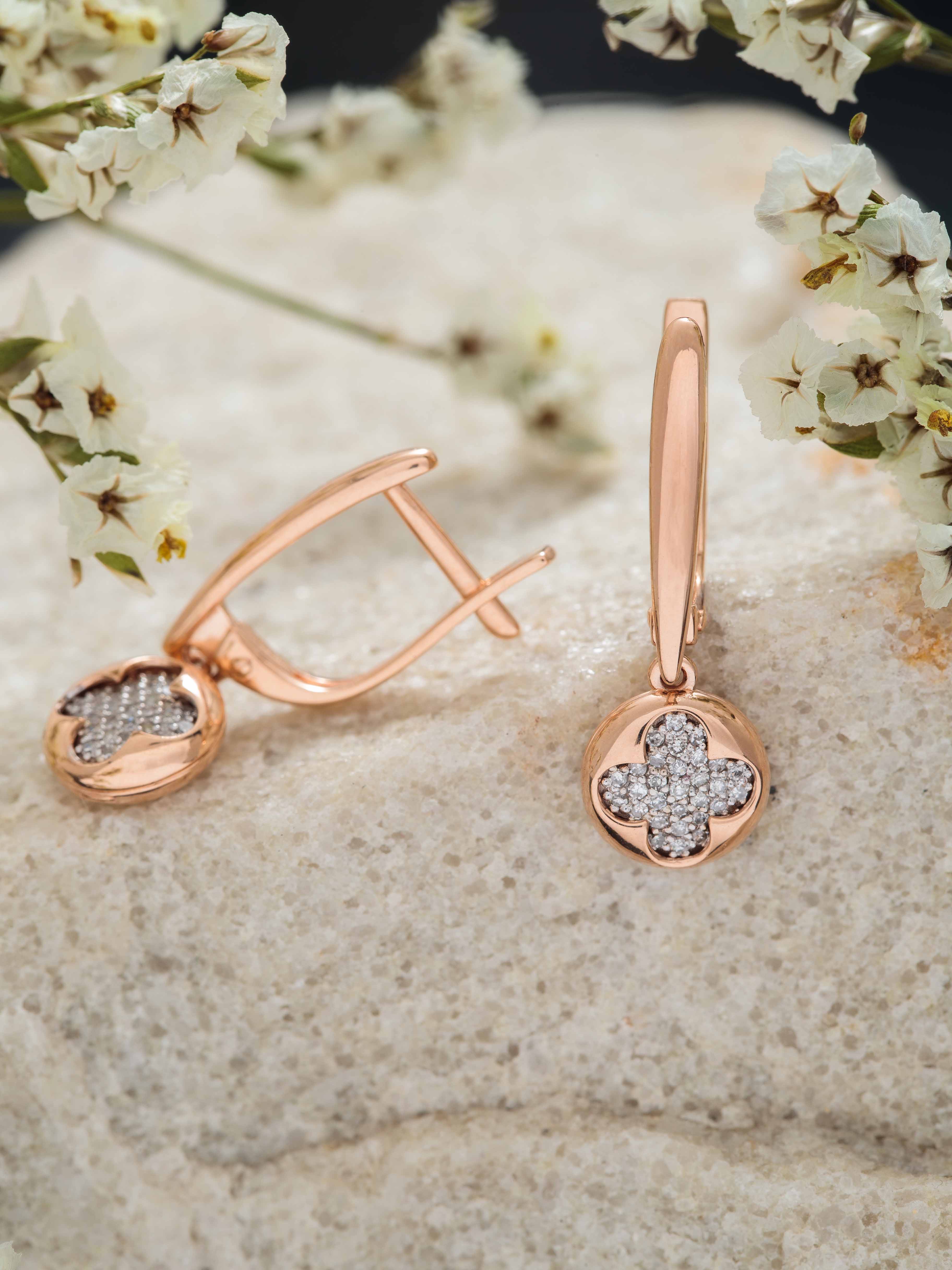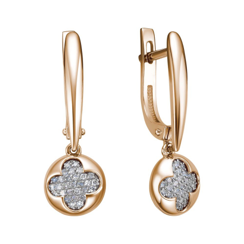 Уникальные серьги из красного и белого золота 585 пробы с английскими застёжками отличаются изысканным дизайном, где центральное место занимает очаровательный клевер