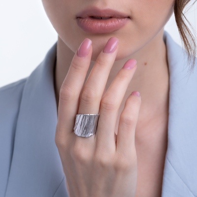 Стильное широкое кольцо с оригинальной обработанной поверхностью, выполнено из родированного серебра 925 пробы без камней