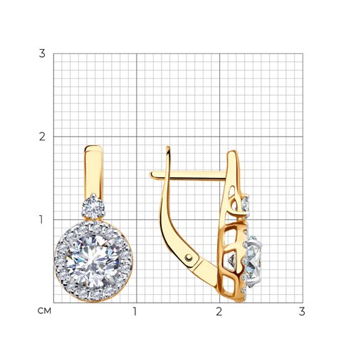 Серьги, украшенные крупным фианитом, в окружении фианитов меньшего размера, выполнены из красного золота 585 пробы