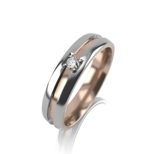 Полновесное обручальное кольцо из красного и белого золота 585 пробы, форма кольца прямая "шайба", со вставкой из бриллианта, который придает искрящийся блеск