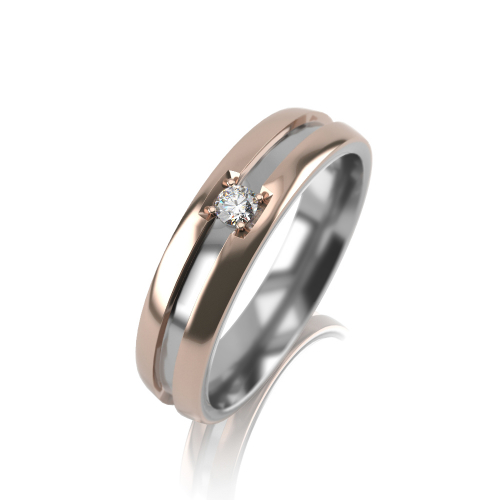 Стильное обручальное кольцо прямого профиля из комбинированного золота 585 пробы, украшенное бриллиантом