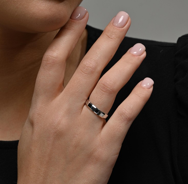 Полновесное обручальное кольцо с прямым профилем "шайба", выполнено из белого золота 585 пробы, особую оригинальность кольцу придают скошенные края в сочетании с идеально гладкой поверхностью кольца