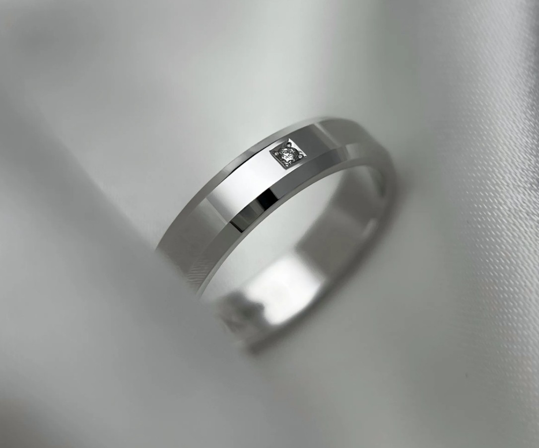 Полновесное обручальное кольцо с прямым профилем "шайба", выполнено из белого золота 585 пробы, особую оригинальность кольцу придают скошенные края в сочетании с идеально гладкой поверхностью кольца