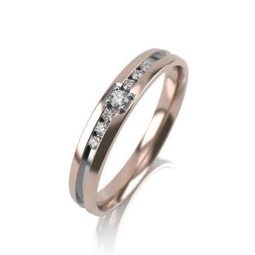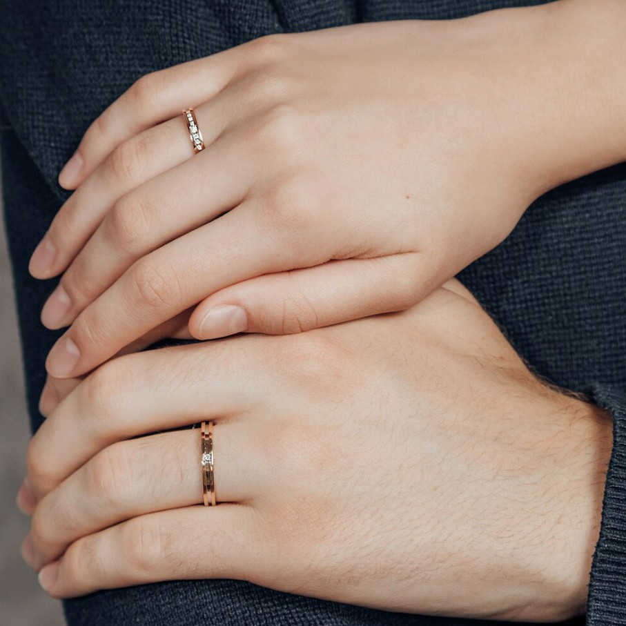 Стильное парное обручальное кольцо, выполнено в сочетании красного и белого золото с семью бриллиантами