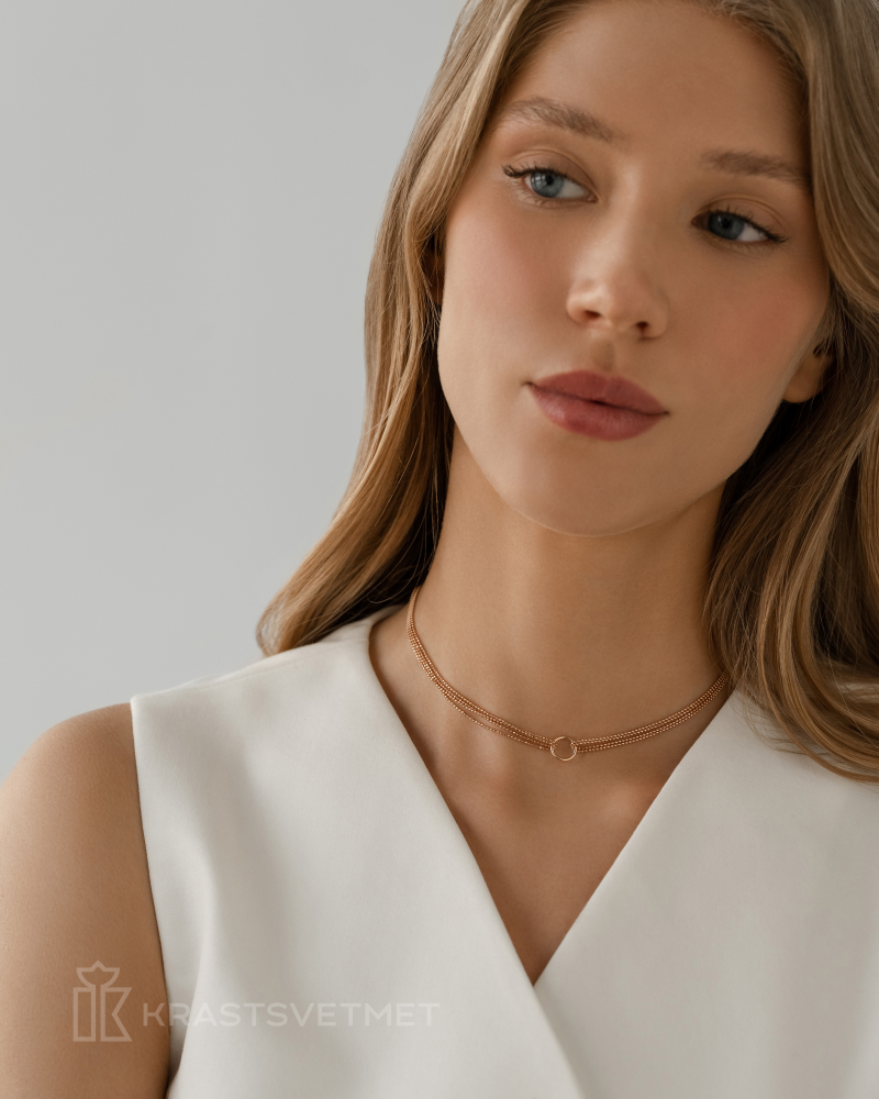 Оригинальное колье из красного золота 585 пробы украсит вашу шею мягким сиянием классического плетения «Перлина»