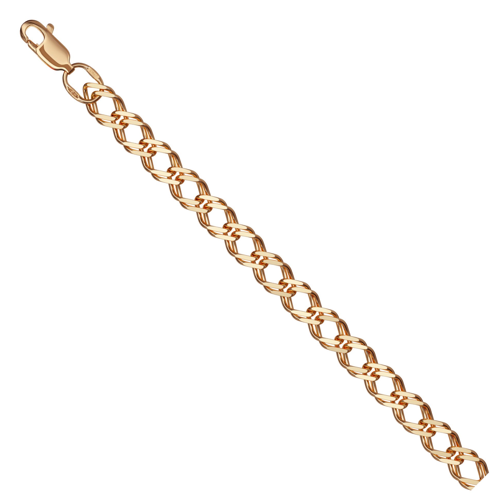 Изящность и мощь соединяются в одной цепочке: крупная полновесная цепь из драгоценного красного золота 585 пробы, украшенная великолепным плетением «двойной ромб», сверкает своей уникальной алмазной гранью