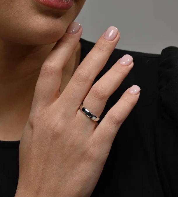 Полновесное обручальное кольцо с прямым профилем "шайба", выполнено из белого золота 585 пробы, особую оригинальность кольцу придают скошенные края в сочетании с идеально гладкой поверхностью кольца