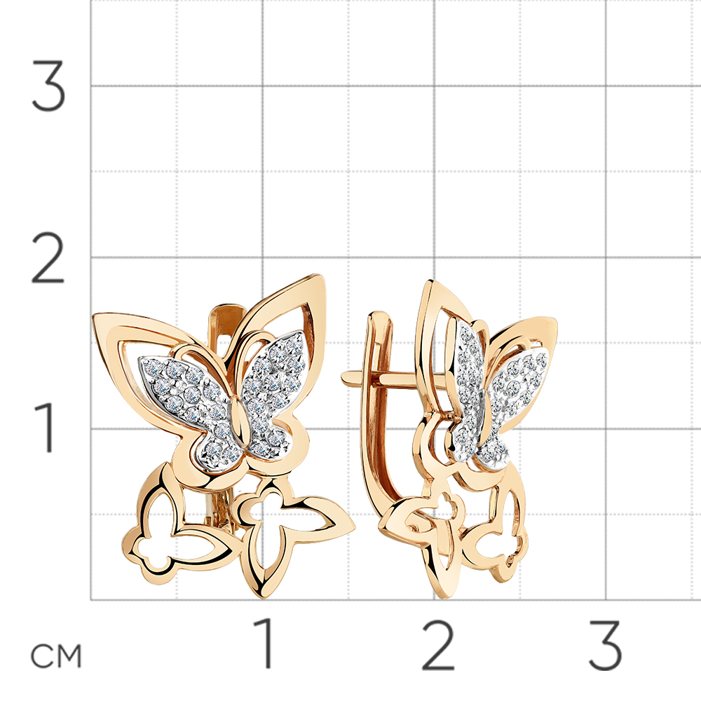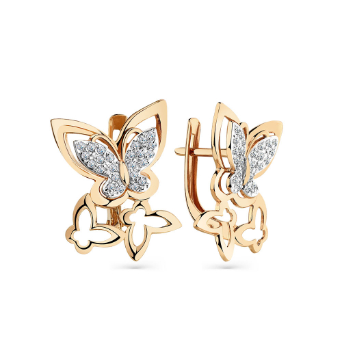Стильные серьги в виде бабочек, выполнены из красного и белого золота 585 пробы, украшены великолепными сияющими фианитами