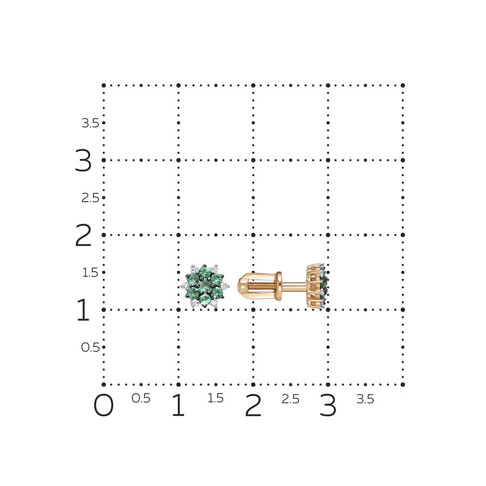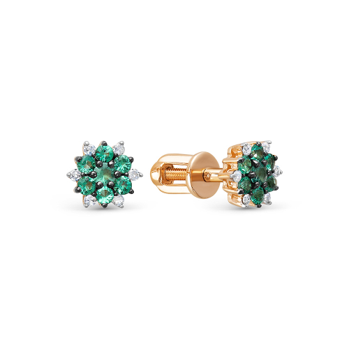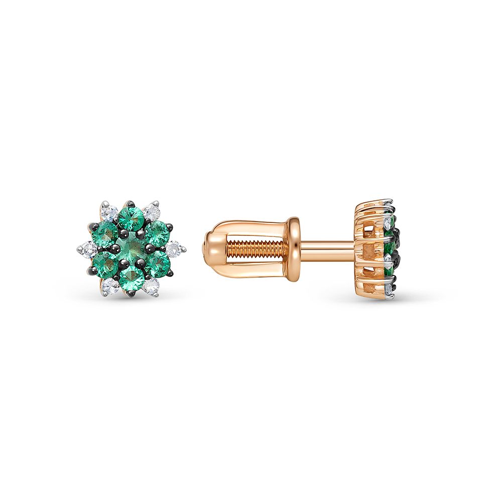 Яркие и привлекательные серьги - пусеты с натуральными изумрудами и сверкающими бриллиантами выполнены из красного золота 585 пробы