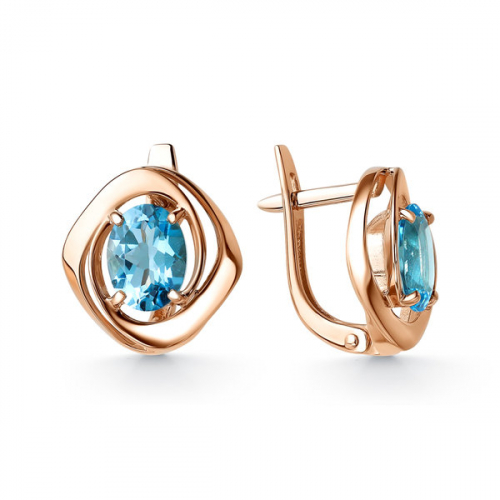 Яркие серьги с объёмным фантазийным дизайном, выполнены из красного золота 585 пробы, украшены нежно- голубыми топазами