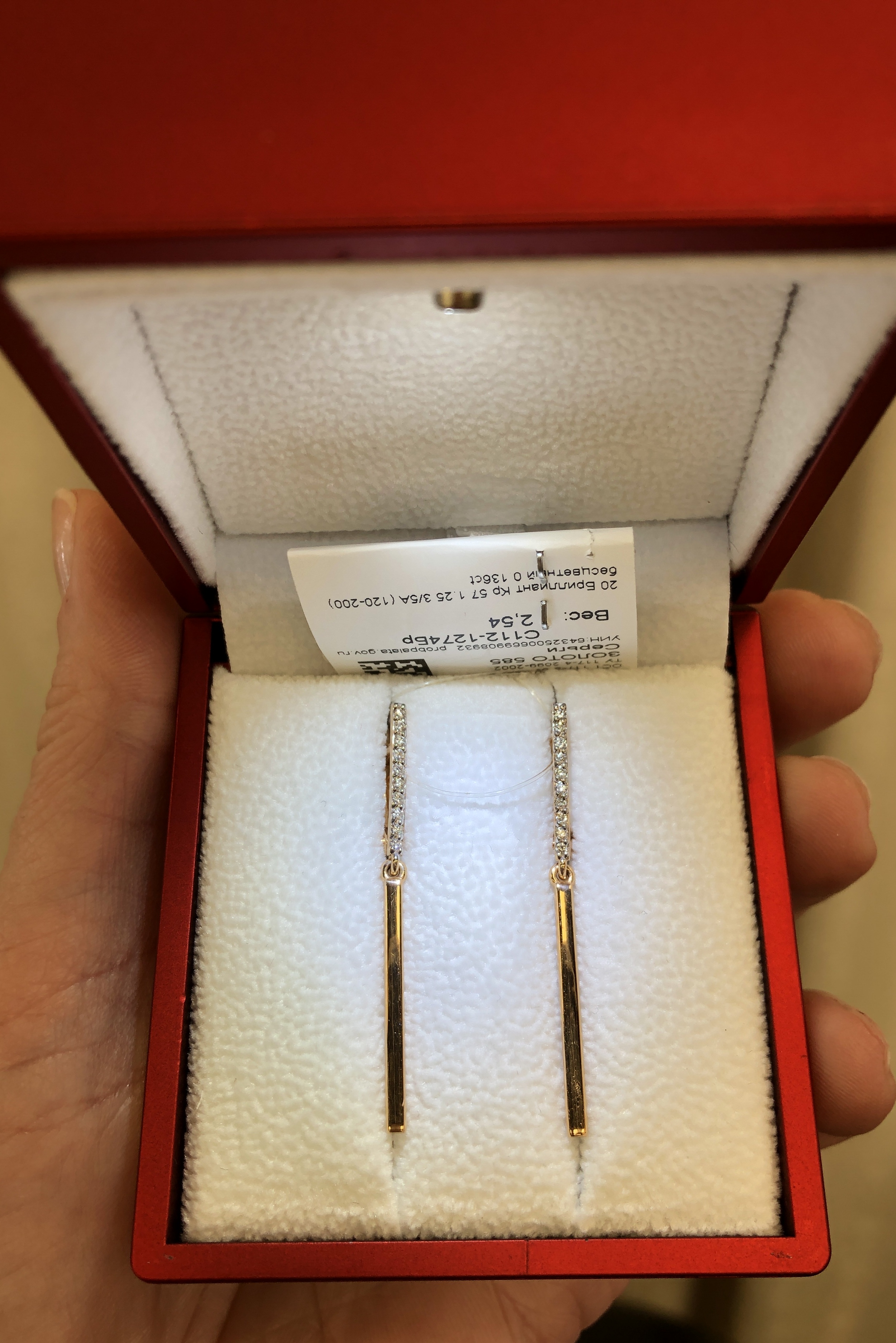 Удлинённые серьги, украшенные дорожкой бриллиантов, выполнены с сочетанием красного и белого золота 585 пробы
