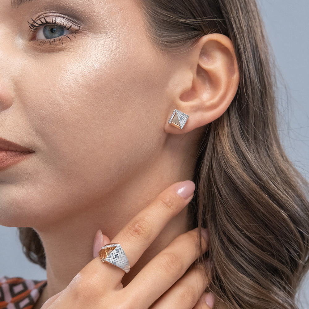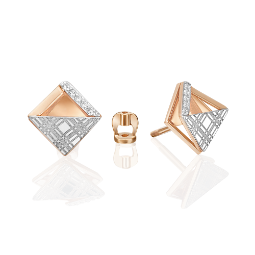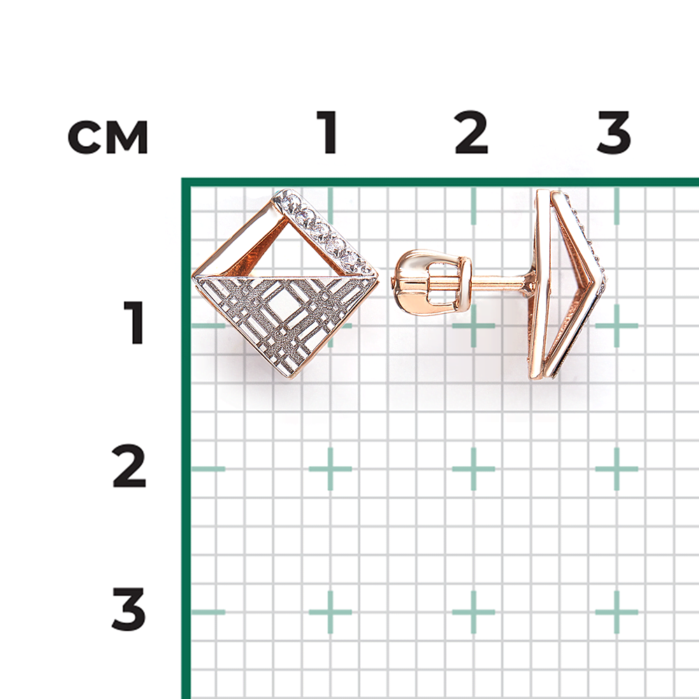 Серьги-пусеты из красного и белого золота 585 пробы с фианитами и фактурным орнаментом клетка Глен из коллекции FASHION by PLATINA от ювелирного бренда PLATINA