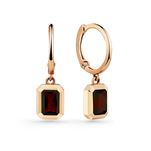 Серьги с эффектной подвеской с гранатом насыщенного красного цвета выполнены из красного золота 585 пробы