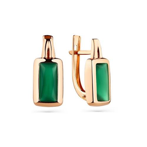 Стильные лаконичные серьги с зеленым агатом огранки багет, выполнены из красного золота 585 пробы