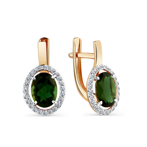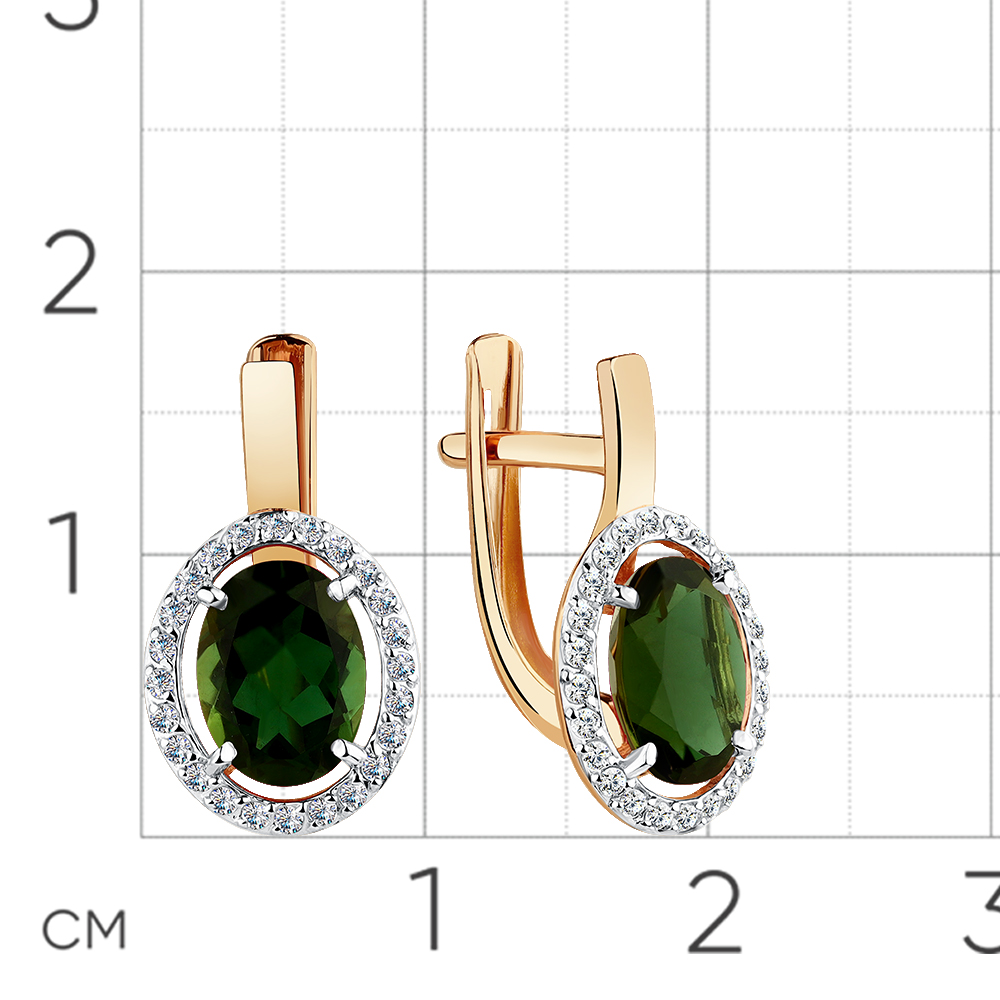 Элегантные серьги классического дизайна, выполнены в сочетании красного и белого золота 585 пробы, украшенные сочными турмалинами в инкрустации сияющих фианитов