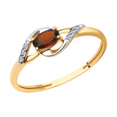 Изящное кольцо с гранатом, красоту которого подчёркивают дорожки фианитов, выполнено из красного и белого золота 585 пробы
