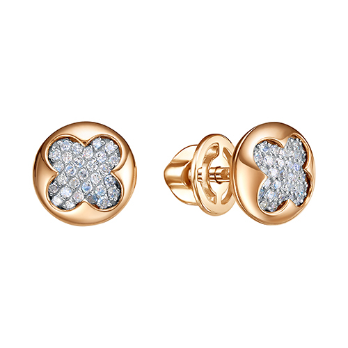 Нежные серьги-пусеты, выполненные из благородного красного и белого золота 585 пробы, украшены россыпью сверкающих бриллиантов, которые создают очаровательную игру света