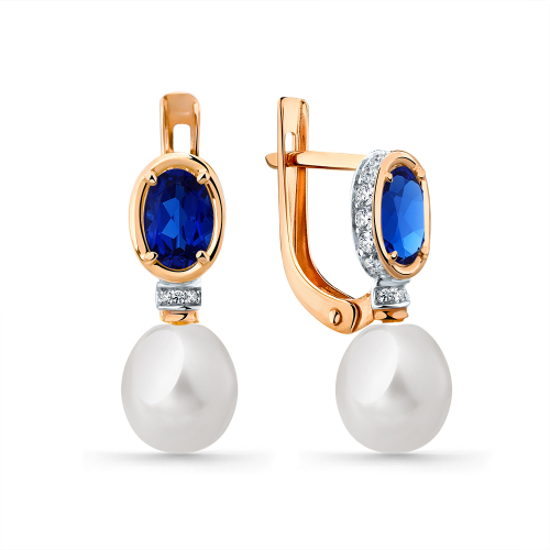 Серьги из красного и белого золота 585 пробы с жемчугом, синтетическим сапфиром и сверкающими фианитами на английской застежке — это элегантное украшение, которое подчеркнет вашу индивидуальность и утонченный вкус