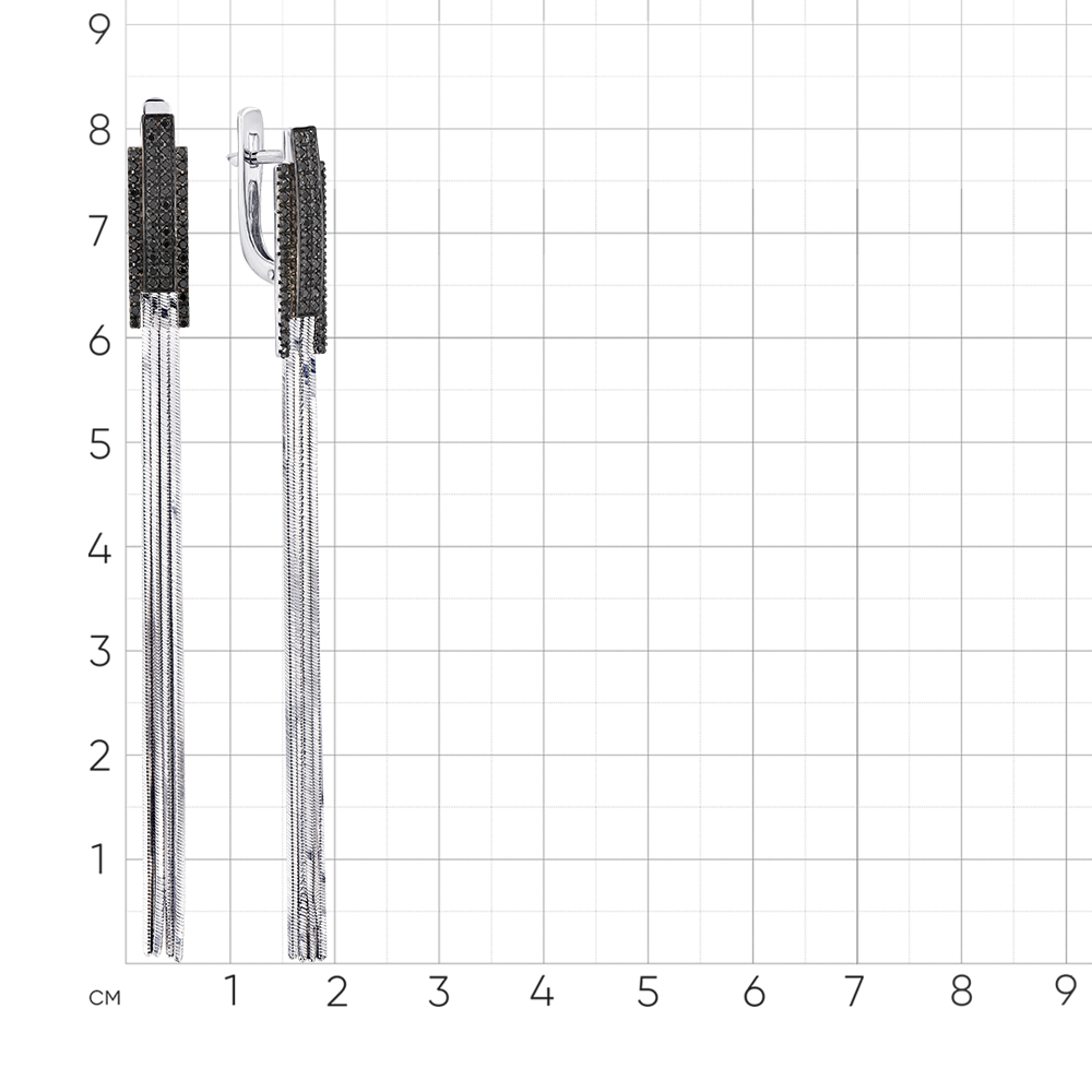 Удлинённые серьги украшенные цепочными подвесками и дорожками чёрных бриллиантов, выполнены из белого золота 585 пробы