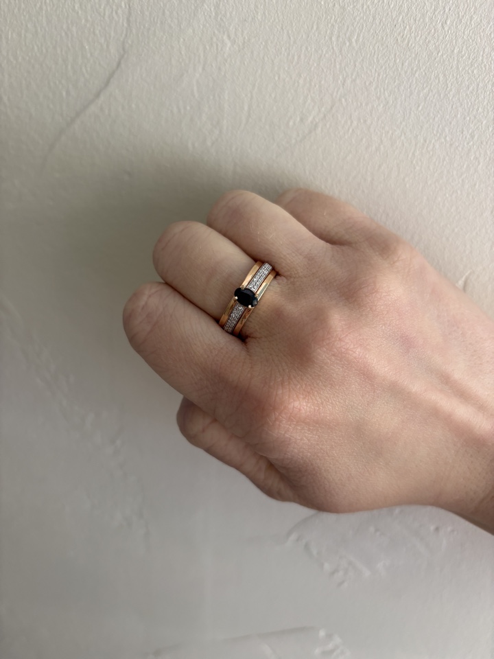 Кольцо с сапфиром овальной формы огранки, насыщенный синий цвет которого подчёркивает двойная дорожка бриллиантов, выполнено из красного и белого золота 585 пробы