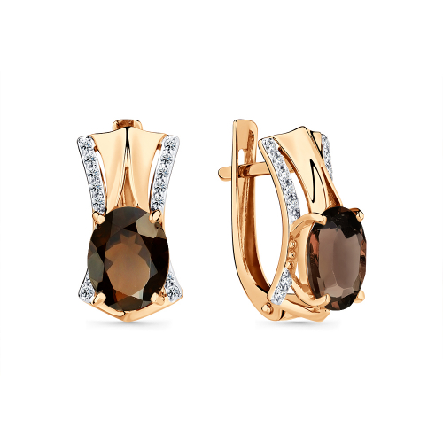 Статусные серьги с дымчато-коричневыми раух-топазами в окружении сверкающих фианитов, выполнены в сочетании красного и белого золота 585 пробы