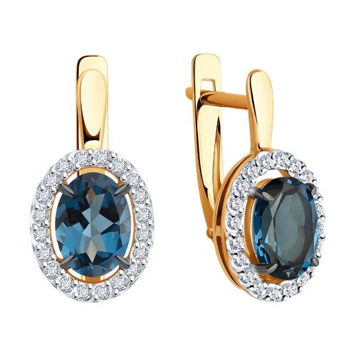 Изящные серьги созданы из сочетания благородных металлов — тёплого красного и холодно-белого золота 585 пробы, гармонически объединённых в одном дизайне. Их центральной деталью выступает глубокий голубой топаз, символизирующий чистоту и гармонию. Топазы нежно окружены маленькими сверкающими фианитами, которые создают дополнительные переливы света и добавляют аксессуару объём и живость. Такие серьги универсальны и превосходно дополняют любые образы, будь то строгий деловой костюм или романтичное платье. Представлено брендом SOKOLOV. Средняя характеристика камней: 40 × Фианит недраг, 2 × Топаз В комплект поставки входит: