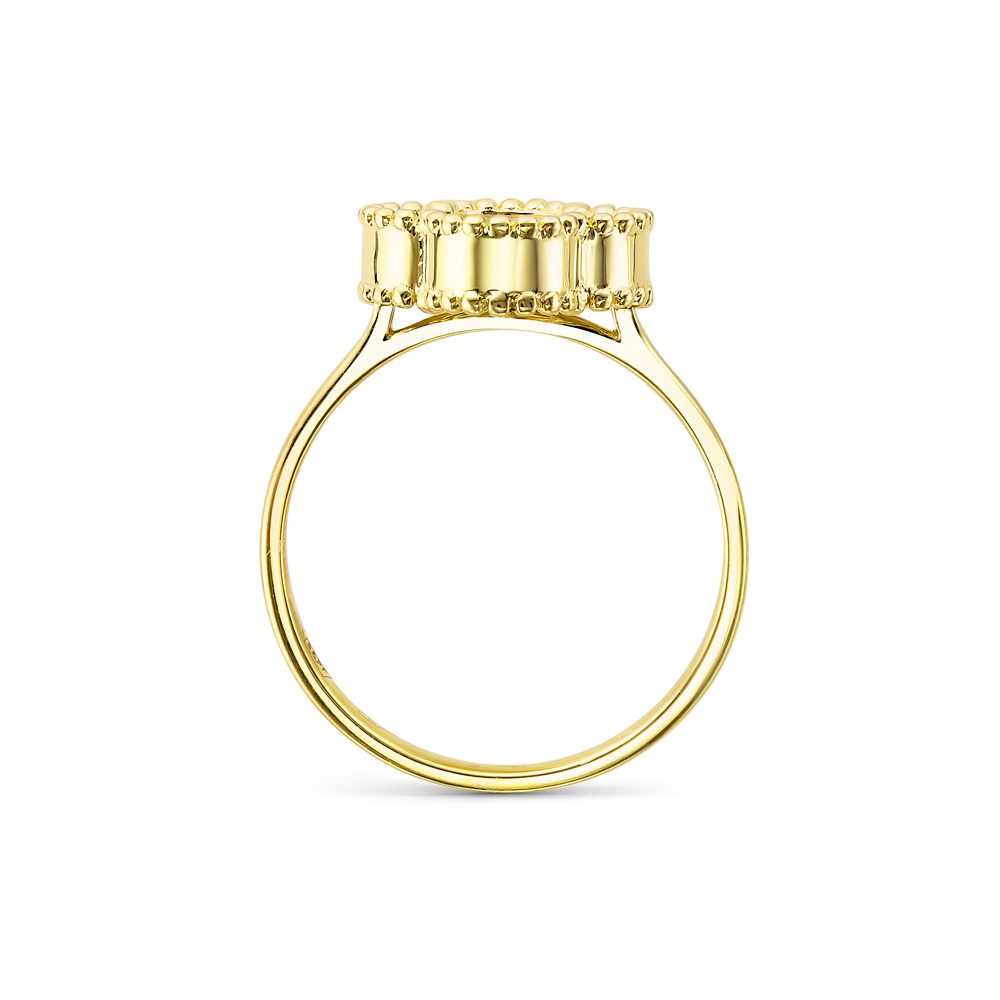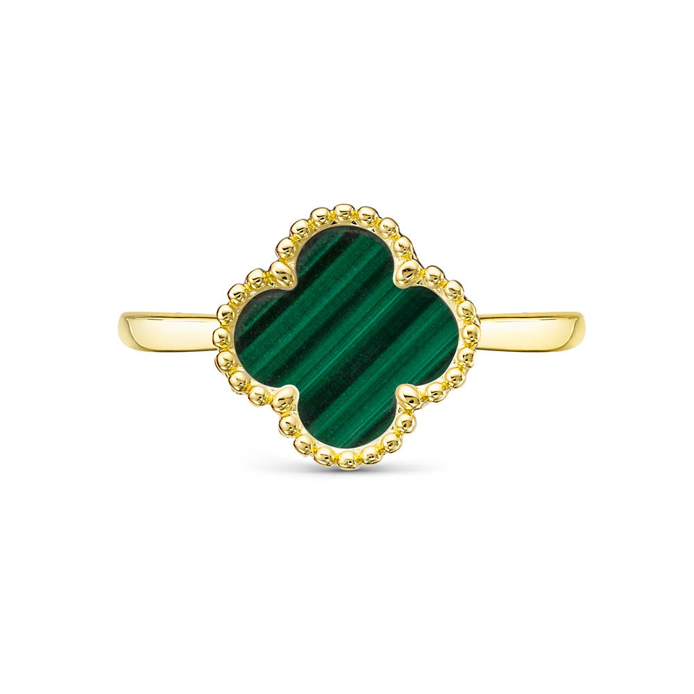 Невероятно красивое кольцо из солнечного жёлтого золота 585 пробы с оригинальной вставкой из глубокого зелёного природного малахита привлекает внимание своим тонким дизайном и яркостью цвета. Уникальная игра оттенков делает изделие особенно выразительным и необычным, оно подходит как для светских вечеров, так и для повседневного ношения. Кольцо отличается высокой прочностью и долговечностью благодаря качественному материалу изготовления, обеспечивая длительное удовольствие от владения эксклюзивным ювелирным шедевром. Представлено брендом ROSE GRACE. Средняя характеристика камней: 1 Малахит Цветок 10,00х10,00 В комплект поставки входит: