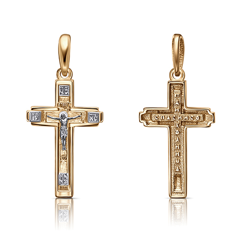 Подвеска в виде нательного креста прямой формы выполнена из комбинированного золота 585 пробы