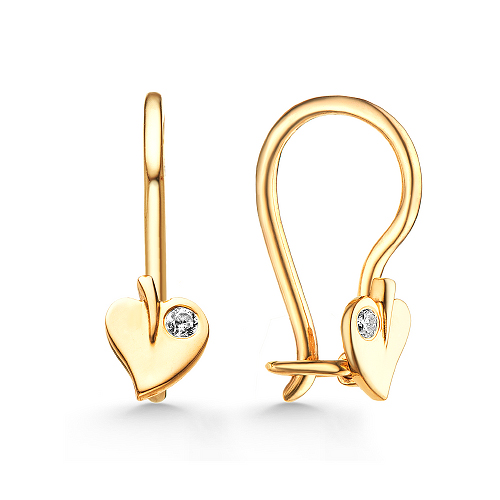 Серьги, в виде листочков, выполнены из красного золота 585 пробы, украшены двумя сверкающими фианитами.