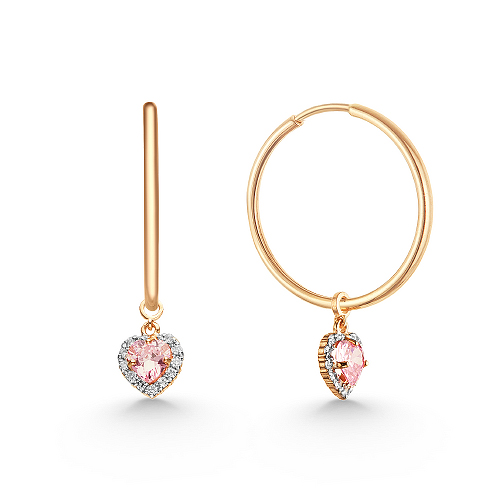 Очаровательные серьги для девочки, в виде колечек с подвесочками сердечками и розовыми фианитами, от бренда Veronika.
