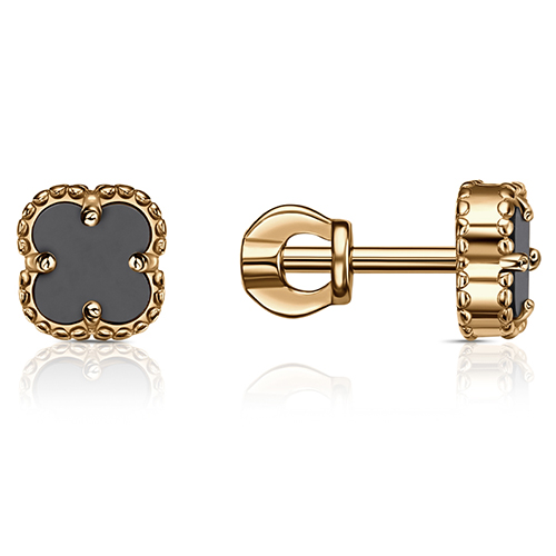 Серьги - пусеты с чёрным агатом выполнены в виде четырёхлистника клевера из красного золота 585 пробы